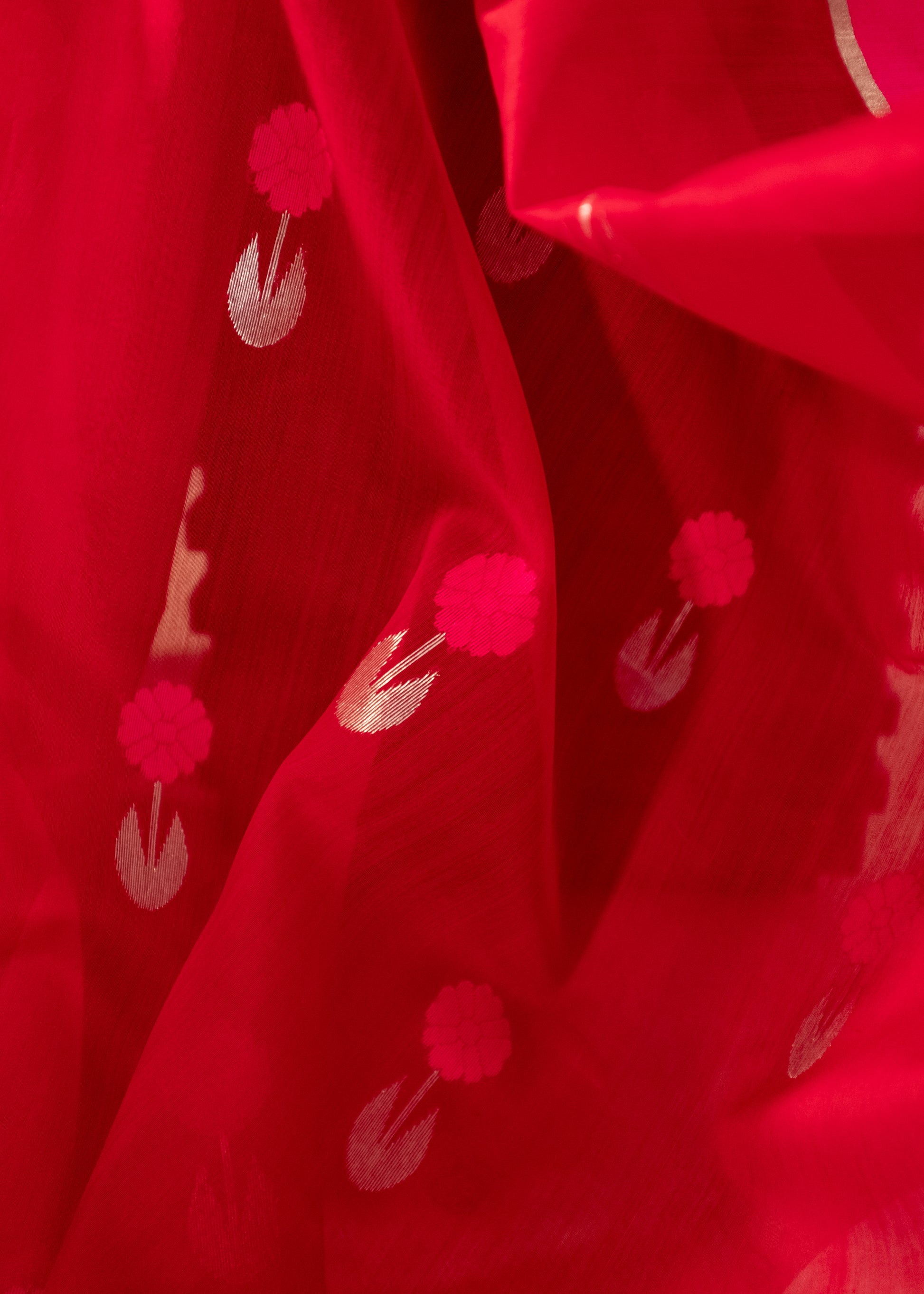 A striking Red Chanderi Handloom Soft Silk saree enhanced with a contrasting pink Mashru border. The lightweight Chanderi weave lends a graceful sheen and airy drape, while the rich Mashru adds a luxurious contrast finish. A perfect balance of tradition and modern vibrance that is ideal for festive occasions or elegant celebrations.