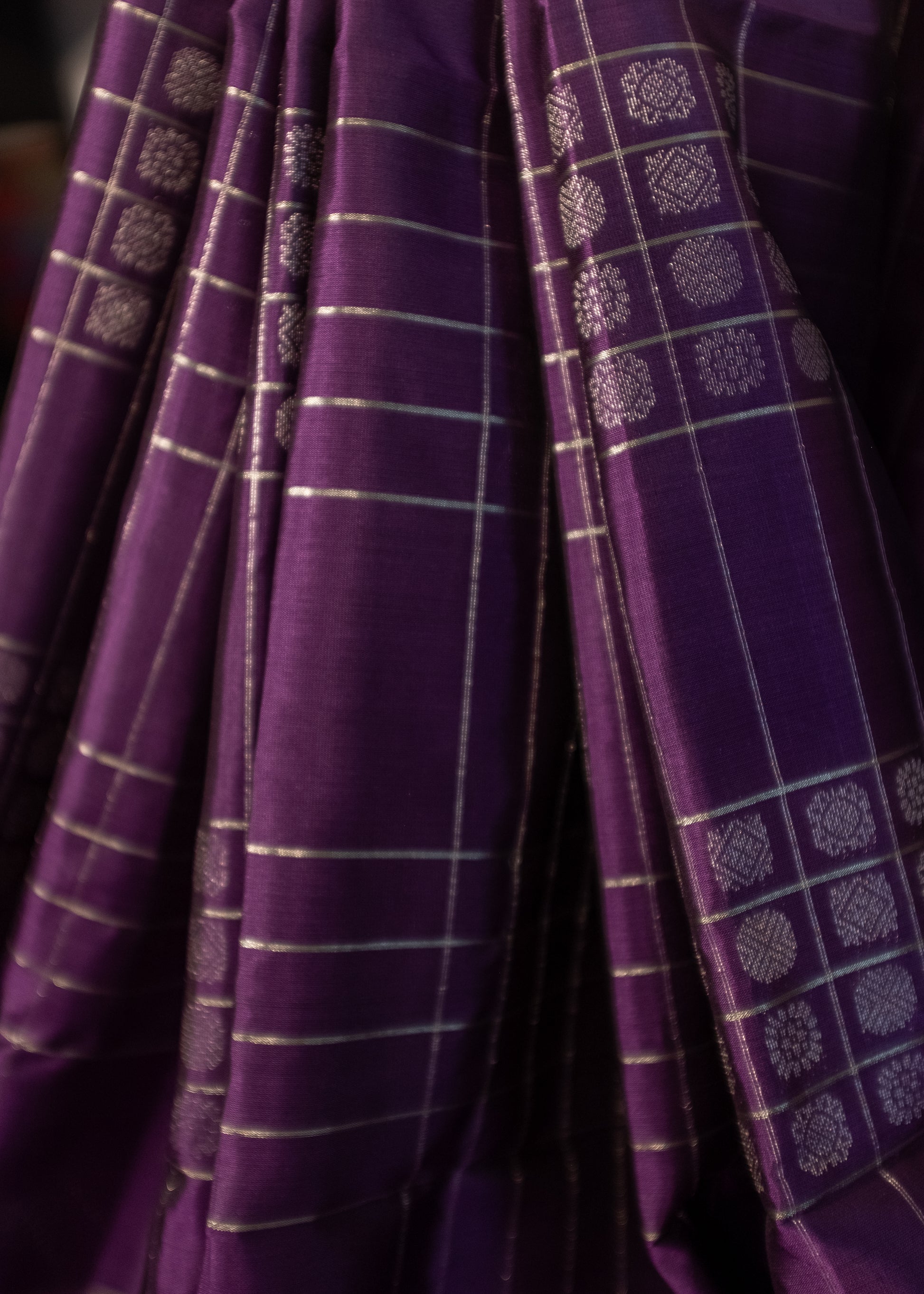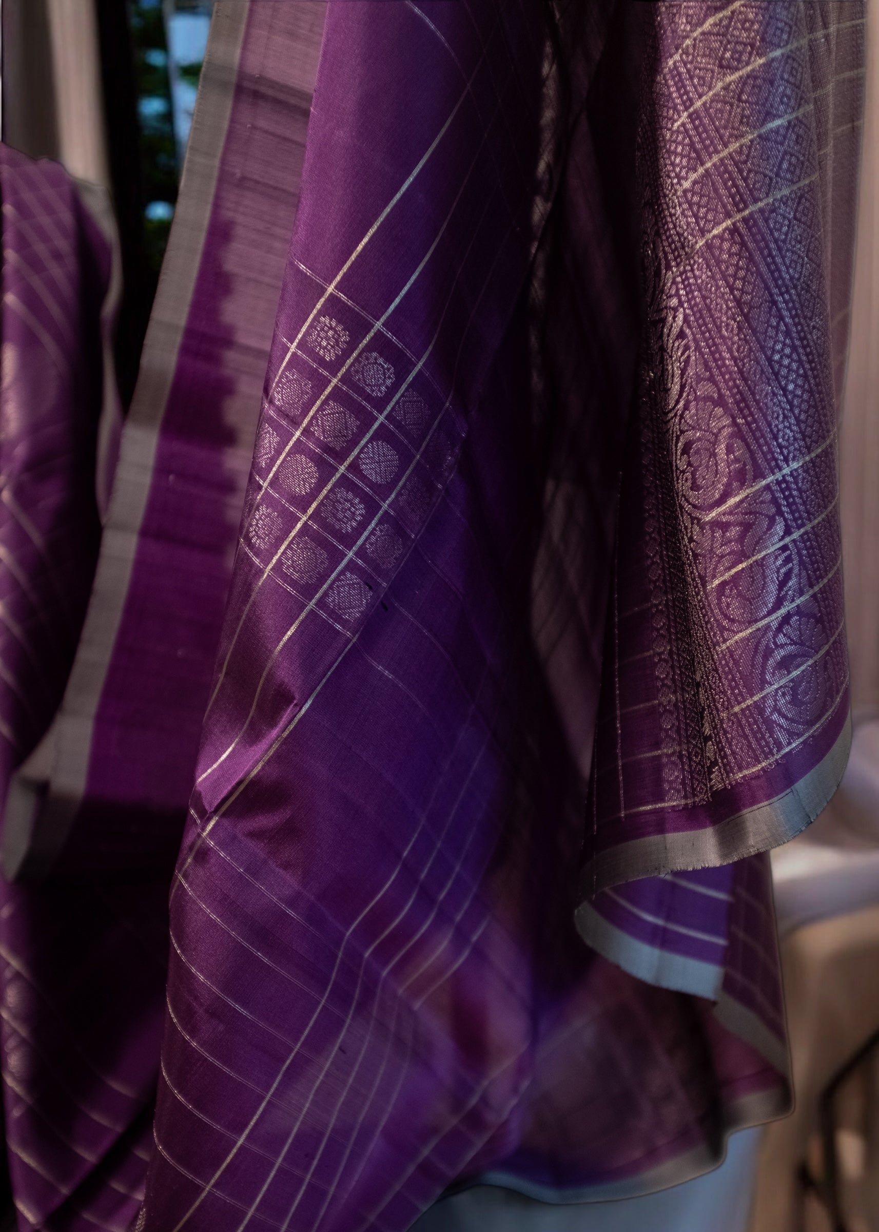 An exquisite Pure Kanchivaram Silk saree in a rich purple hue with classic silver zari checks and peacock motifs, handwoven to perfection by skilled artisans from Kanchipuram. The lustrous silk, traditional weave, and timeless pattern make it a statement piece that embodies heritage and grandeur. Perfect for weddings, festive occasions, and special celebrations, a saree that beautifully balances tradition with elegance.