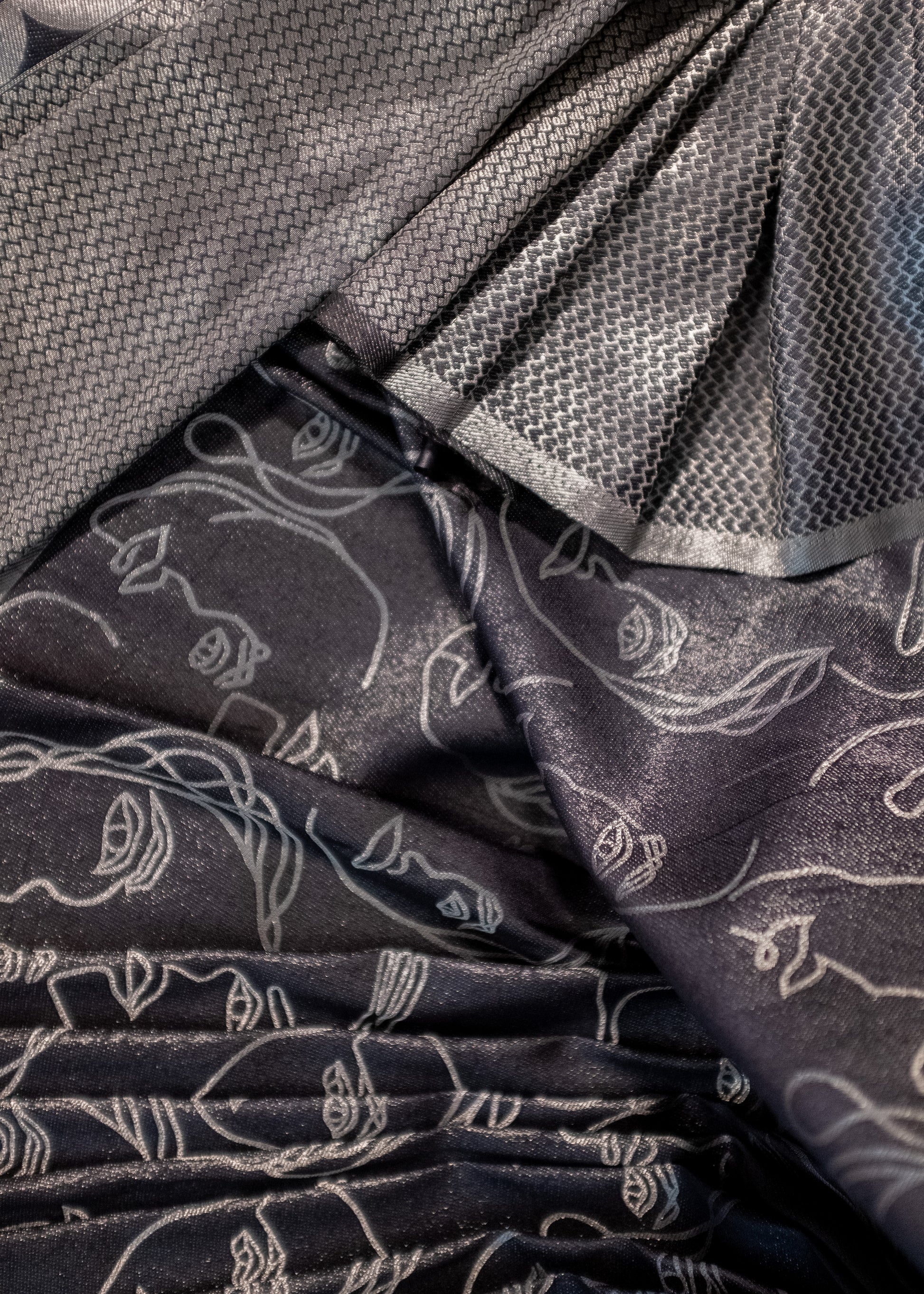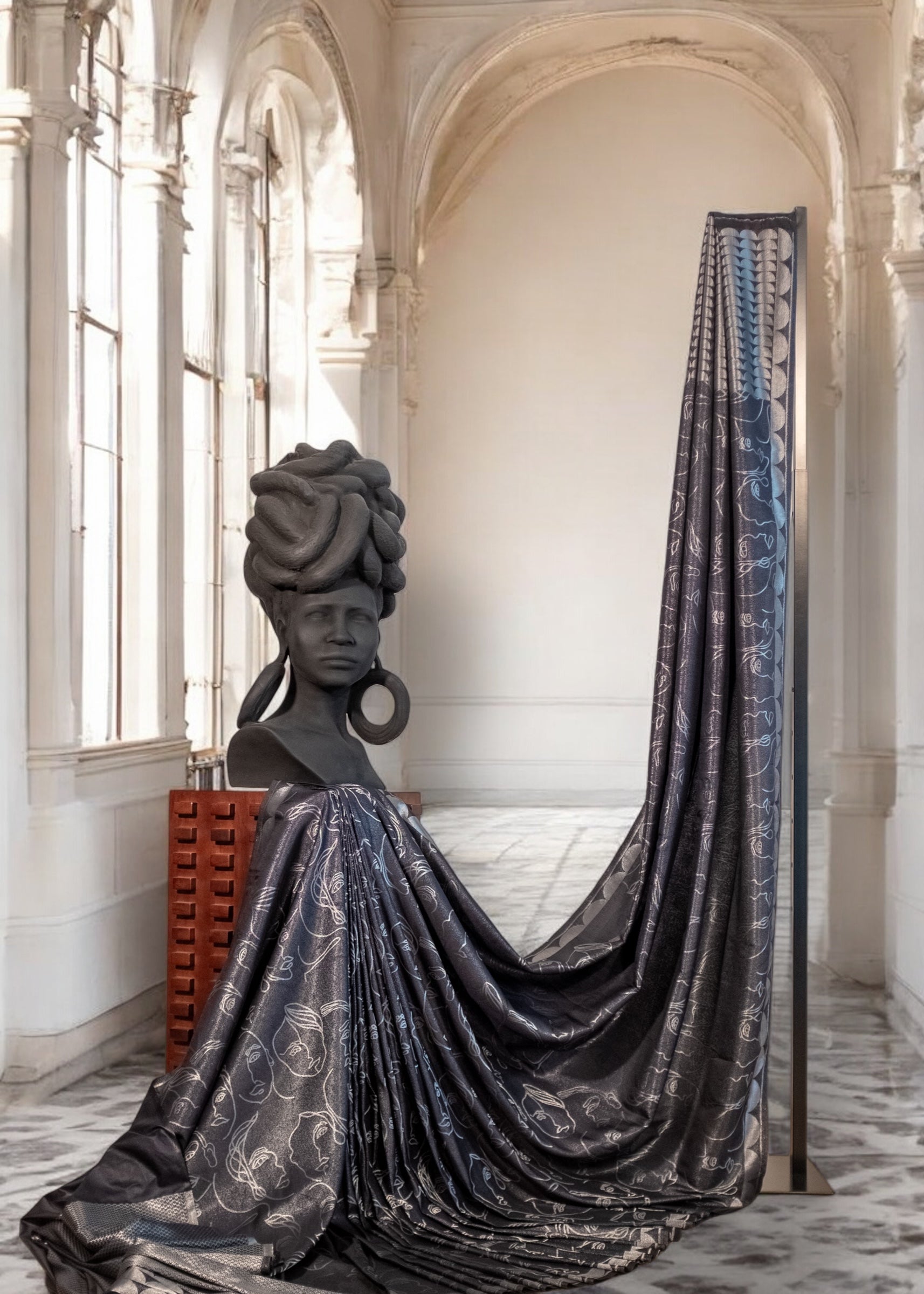 A timeless semi-soft silk saree in classic black, adorned with delicate silver thread zari face motifs all over. Elegant yet contemporary, it’s a statement piece for evening occasions.